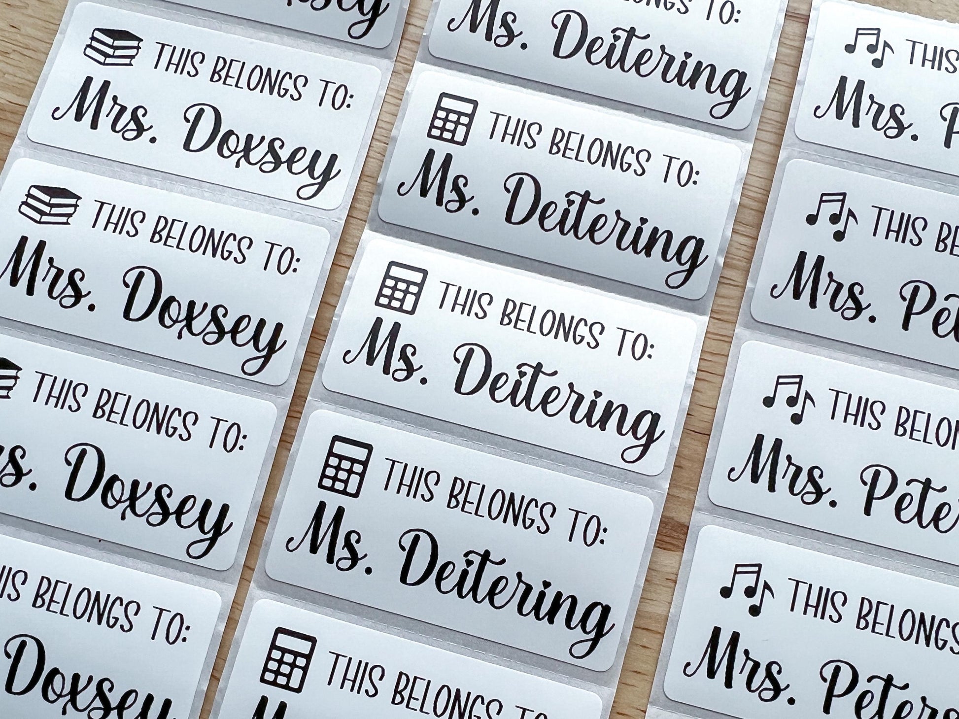 Personalized “This Belongs To” Stickers for Teachers Perfect for labeling supplies, books, toys, and more! These custom name stickers are ideal for teachers, daycare providers, Sunday school leaders, and coaches. Choose from fun icons like books, music notes, sports, calculators, and more to match your style or subject. Great for classrooms, libraries, or shared spaces - just peel and stick! Note: Stickers are water resistant but should be hand washed only if used on items like water bottles.